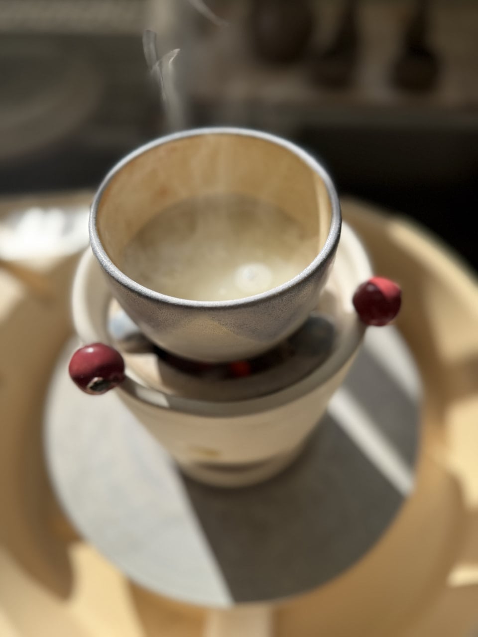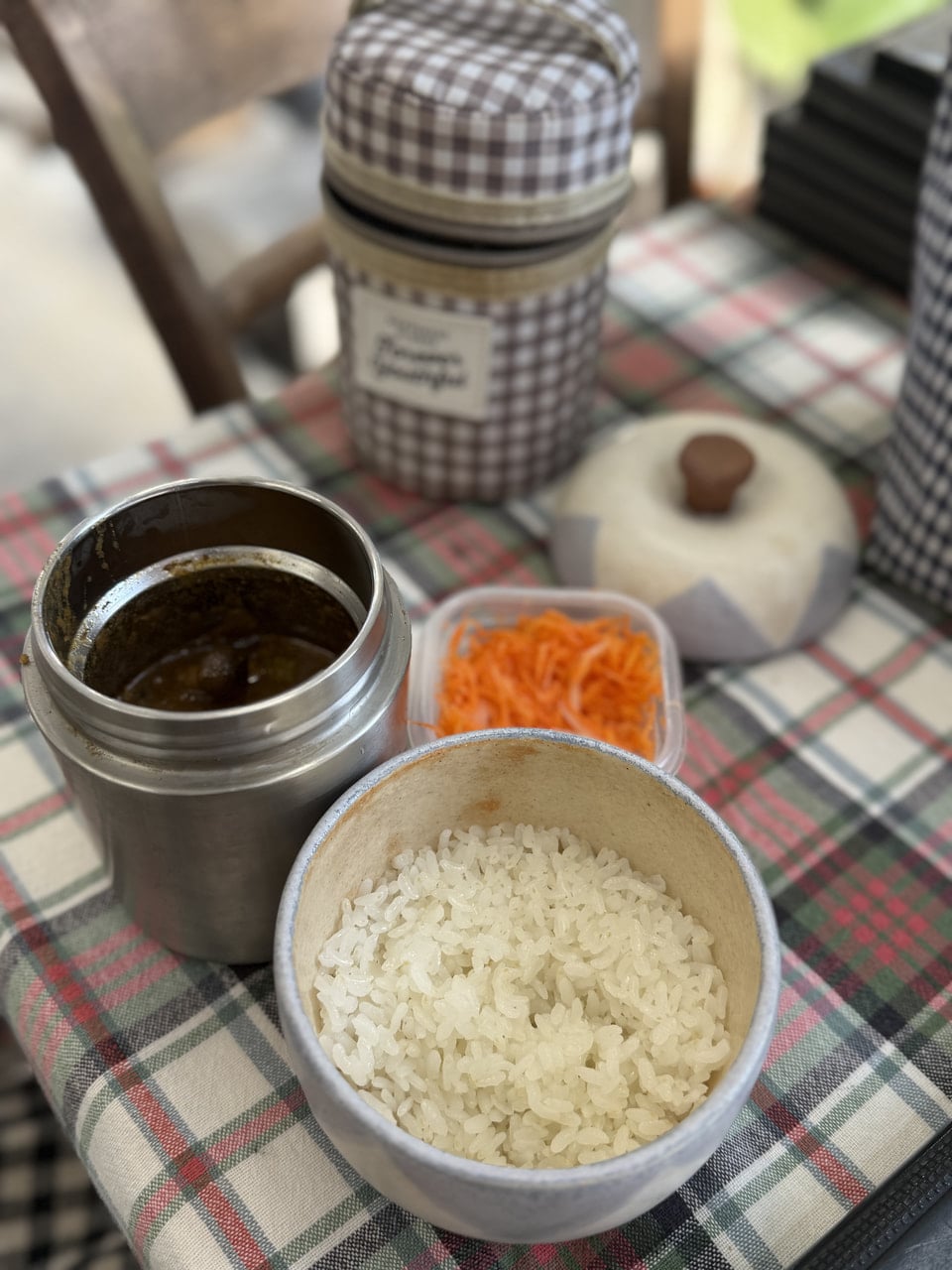 リンゴポット🍎で炊く炭火ご飯🍚 2025年12月12日 教室だより 今日のお昼ごはん 炭炉で炊いたお米とカレーです。 炭炉で炊くのは二回目でした。 今回はおこげなしでモチモチに炊けています。 炊き上がり後も30分以上経っても温かく、おいしくご飯が食べられました。 カレーはレトルトのポークピンダルーをアレンジ、🍄と🥦を入れて、付け合わせはキャロットラペです。 炭のはぜる音と香りに癒されながら、炭を足していくのも楽しみな作業です。 今度はお餅を焼こうかなー。 元のページへもどる