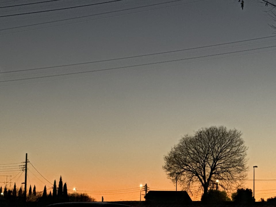 西の空は夕焼け、木々のシルエットが絵画の中にいるようです。