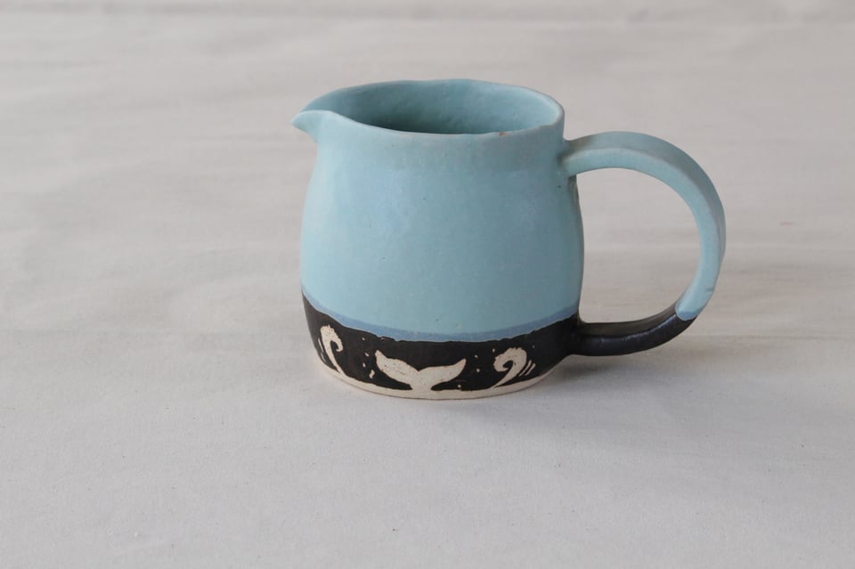 耐熱のポット 2025年10月22日 生徒作品 食器 手びねり 耐熱土作品 耐熱の土でつくられた直火用のポットです。黒マット釉のところは撥水剤で模様を描き、白い土の色が見えています。青磁マット釉を掛けて重なった部分の色もきれいですね! 青い海と遠くに見える島、深海の魚たちのようにも見えてきます。酸化焼成です。 元のページへもどる