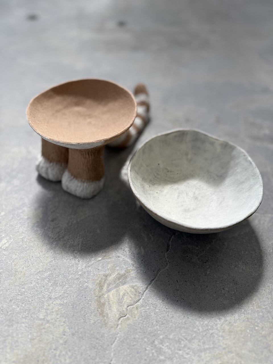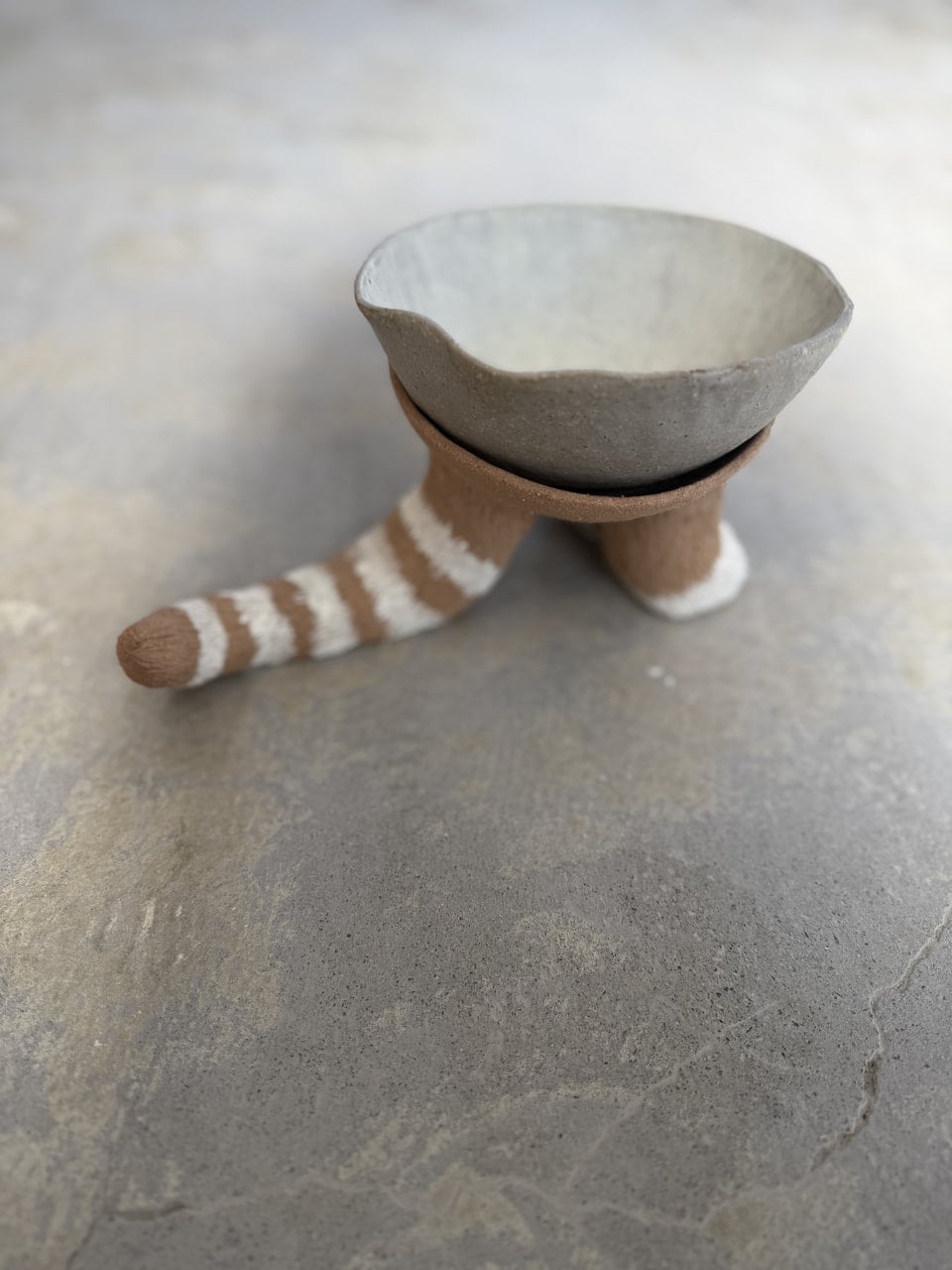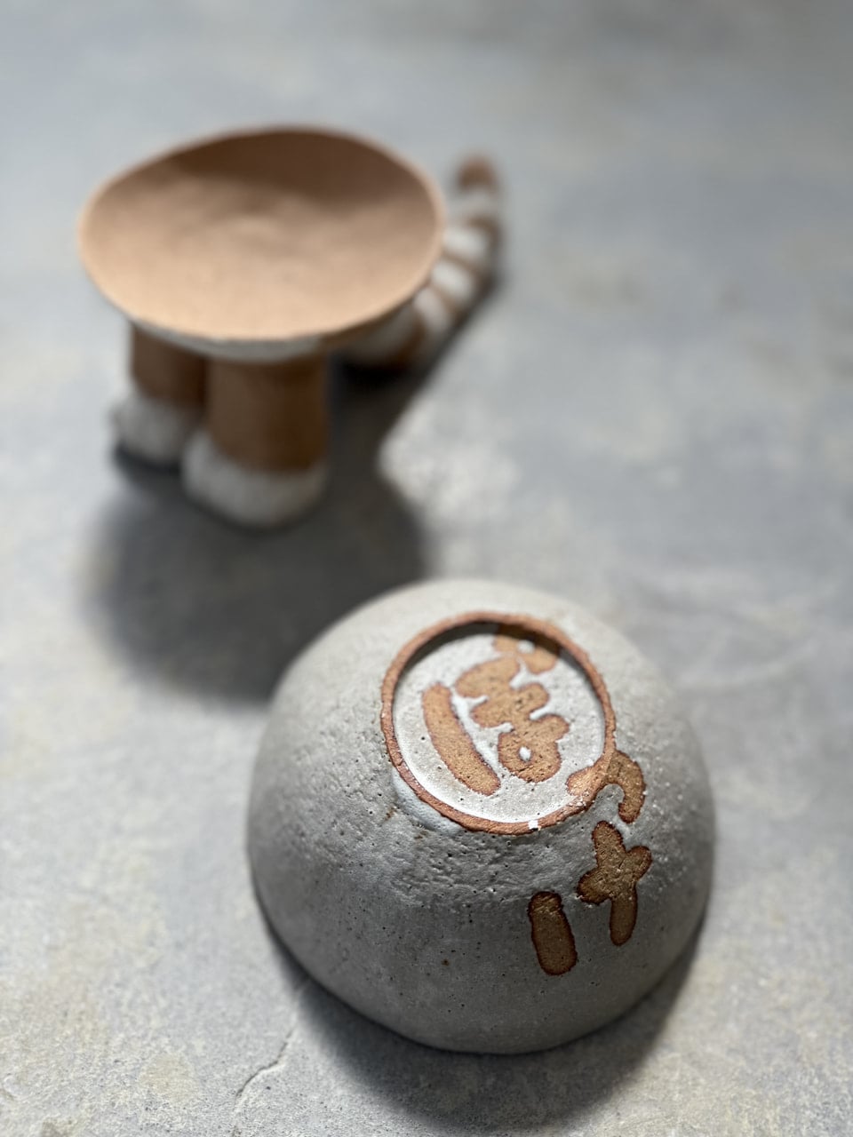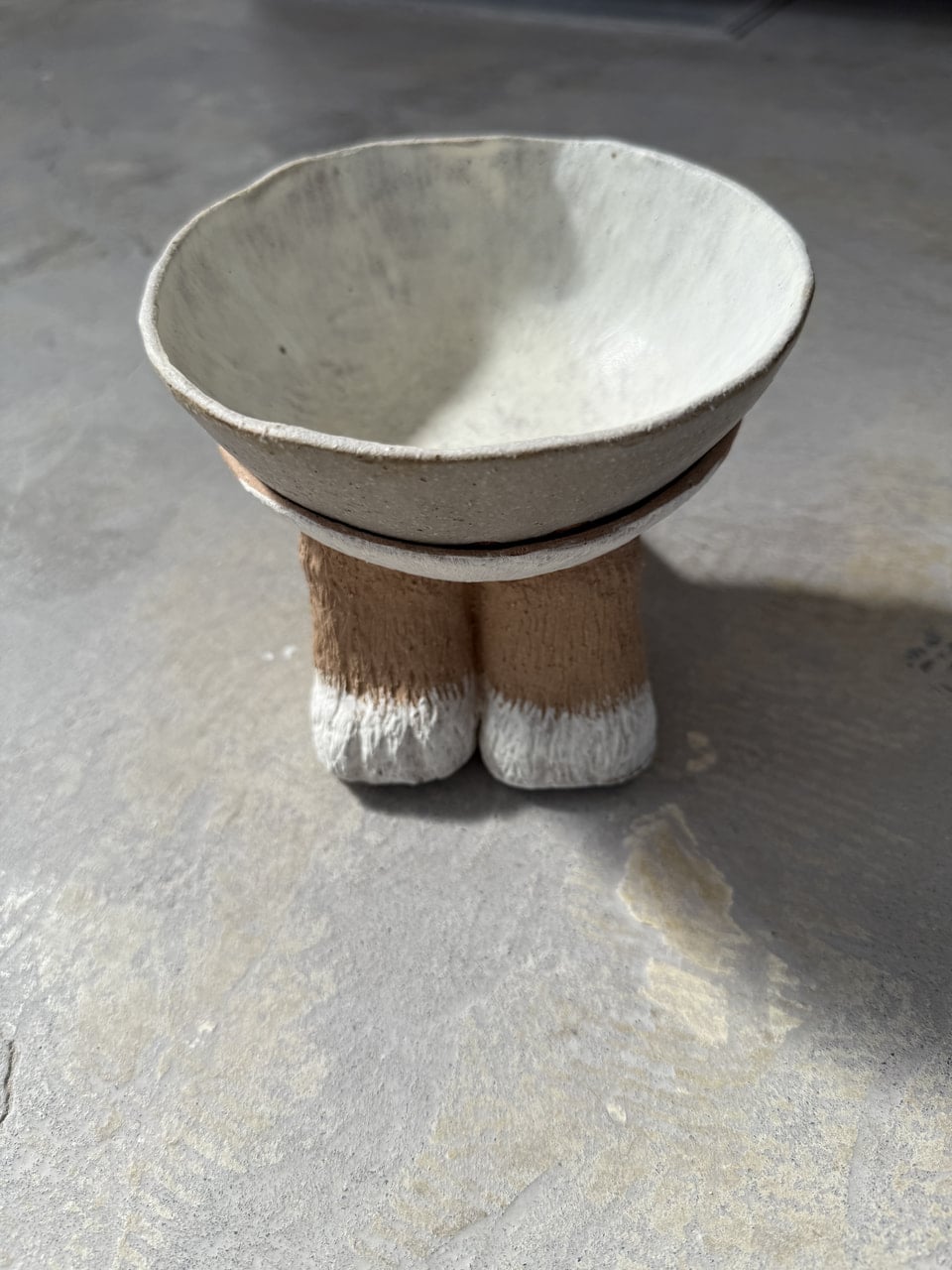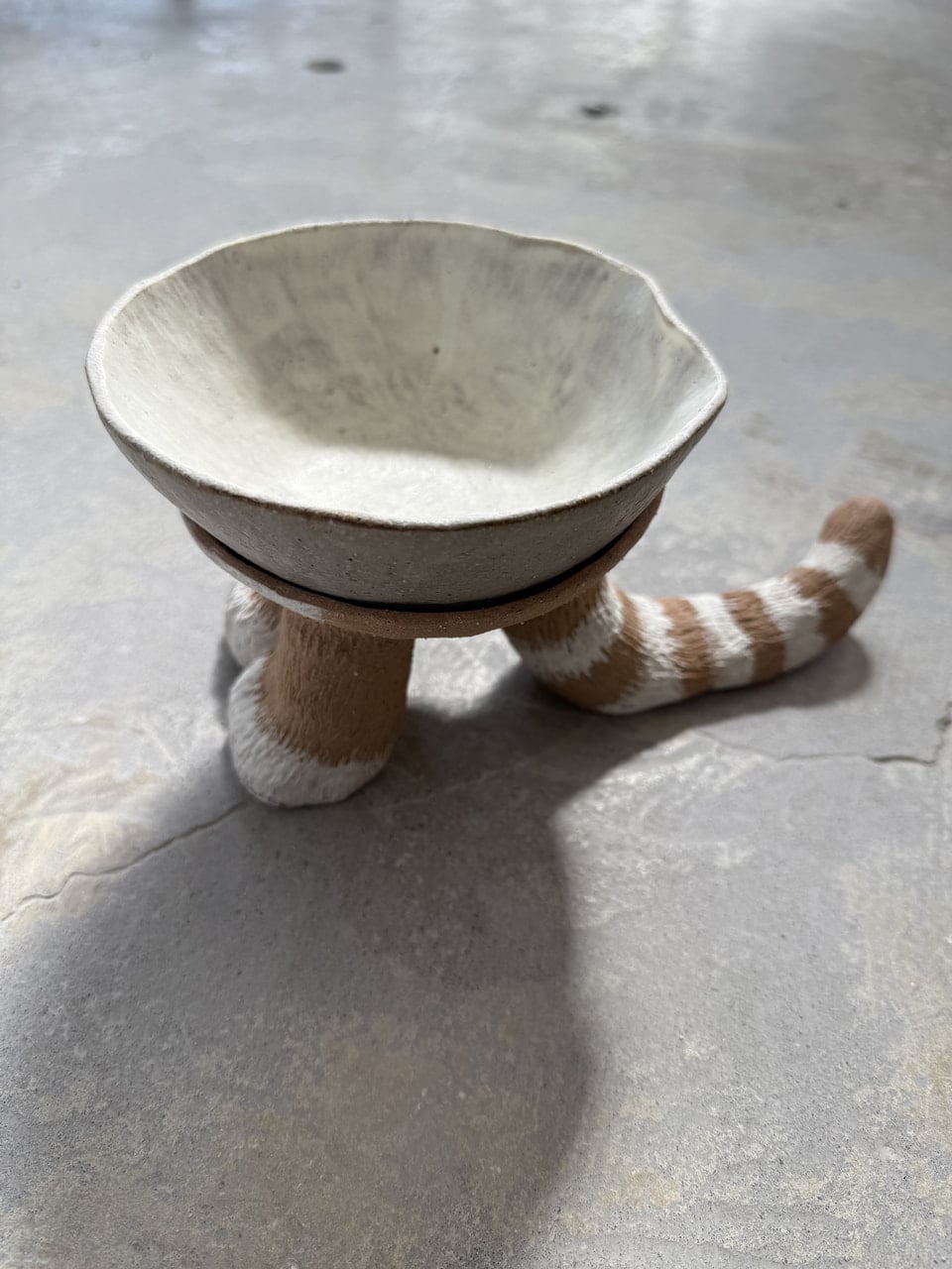 ぽっけちゃんのうつわ 2025年11月 2日 生徒作品 食器 手びねり 飼い猫のぽっけちゃんのための器です。器の部分は取り外せるようになっていてお水やカリカリと分けても使えそうです。足としっぽだけ見ていると本物の猫がいるようで、不思議な存在感です。ぽっけちゃんがこの器でごはんを食べているのを見たら、二匹で向かい合っているお友達のような感じなのでしょうか?佇まいが、かわいいのであちこちからカメラを向けたくなってしまいました。 赤土、白マット釉、酸化焼成です。 元のページへもどる