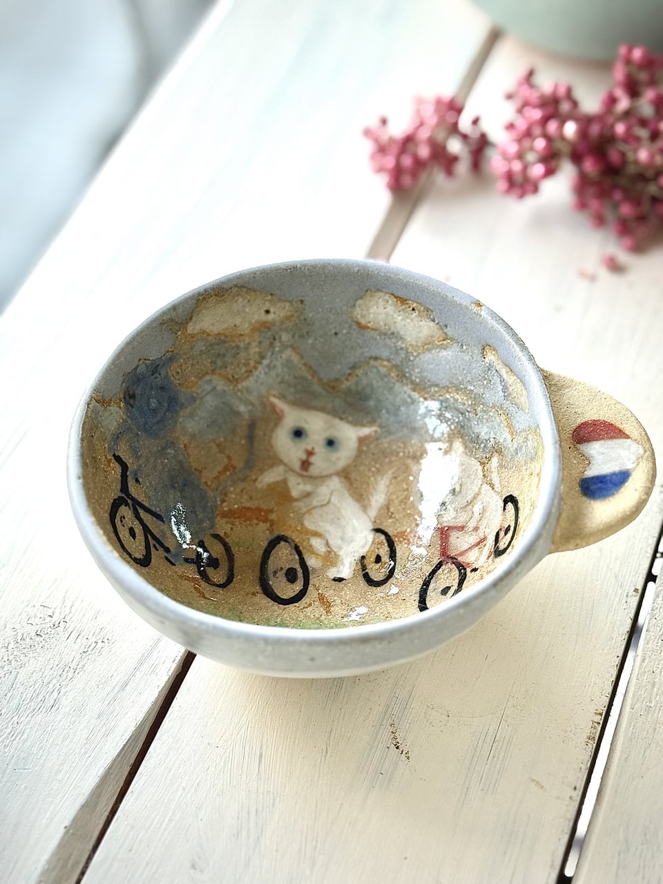 ツールドフニャンス🇫🇷🚲 2026年1月17日 生徒作品 食器 手びねり 絵付け ツールドフランス、ではありませーん! ツールドフにゃんスです。 カフェオレや小鉢、スープにちょうどいい大きさです。 持ち手の裏にもニャンコが休憩しています。 まぜ土、カフェカラー、透明釉、空色釉、シルクマット釉、酸化焼成です。 元のページへもどる