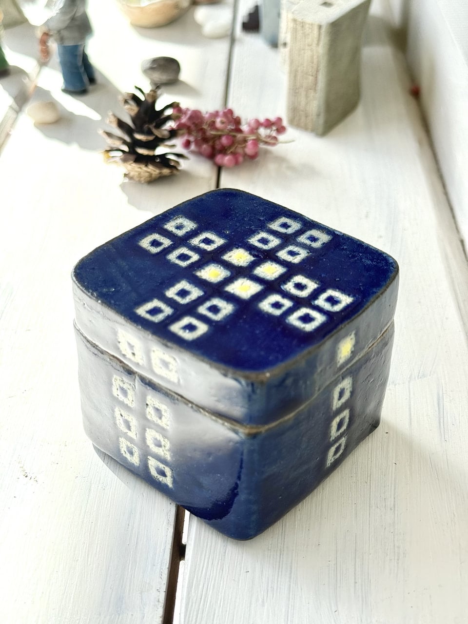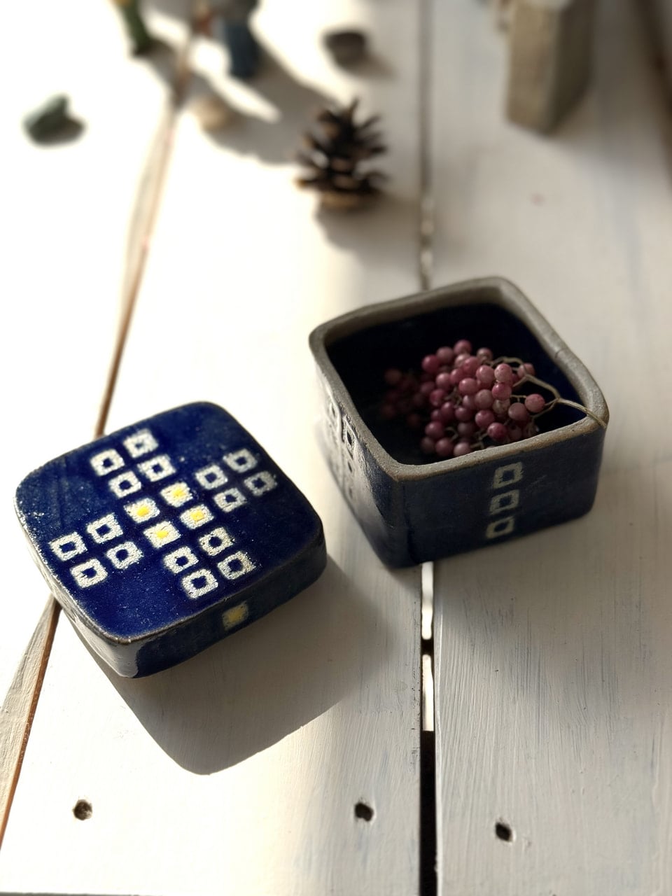 象嵌の蓋もの 2026年3月31日 生徒作品 インテリア その他 手びねり 蓋合わせが難しい手捻りの蓋ものですが、丁寧に作られました。白い部分は古陶土を象嵌してあります。象嵌した中には釉薬と黄色化粧で色をつけています。テーブルに置いて小さなお菓子を入れるのもいいですね。 まぜ土、ルリ釉、酸化焼成です。 元のページへもどる