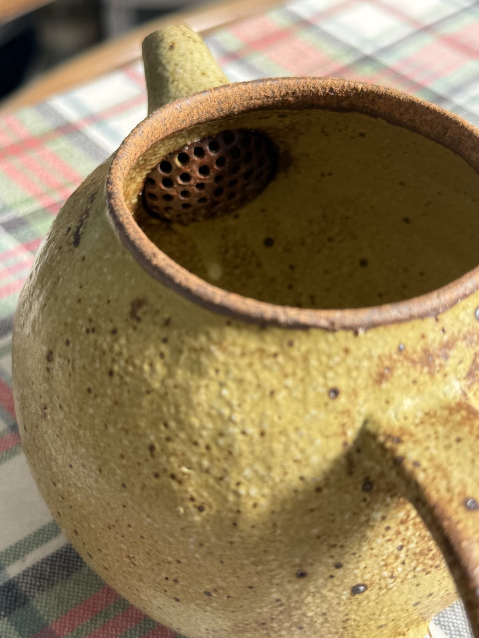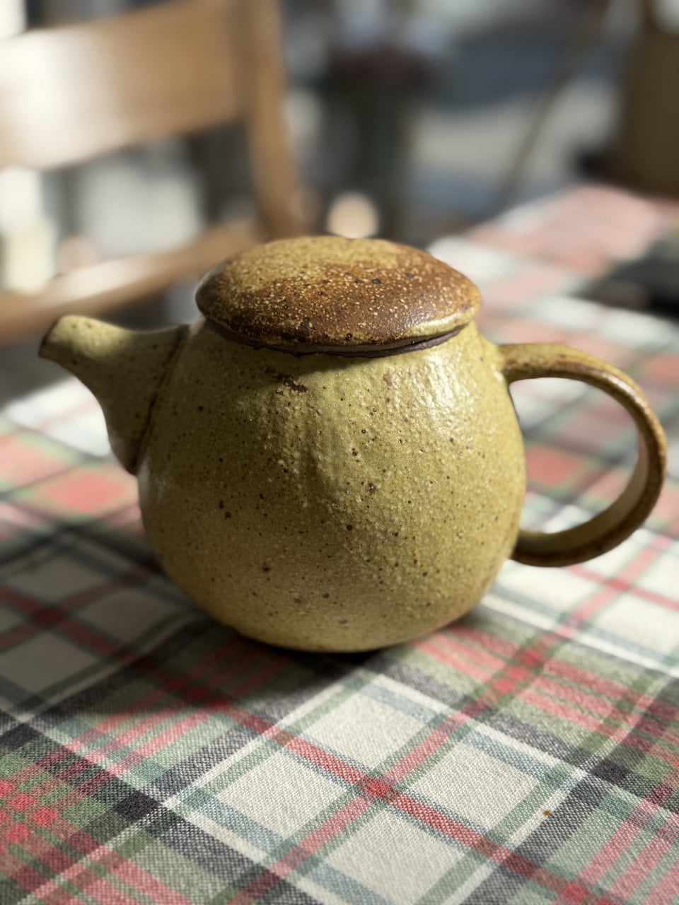 基礎コース ティーポット 2026年4月 1日 生徒作品 食器 手びねり お茶がたっぷり入るポット、土の風合いを活かした還元焼成で焼いています。 釉薬は蛙目マット釉です。黒い点は土の中に含まれる鉄分が還元焼成によって表出してきたものです。酸化焼成では黒い点は出てきません。 茶こしも土で作って、貼り付けています。難しい部分ですが、やってみると楽しいと思います。もちろん、茶漉しはなくてもティーポットは作れます。 赤土、蛙目マット釉、還元焼成です 元のページへもどる