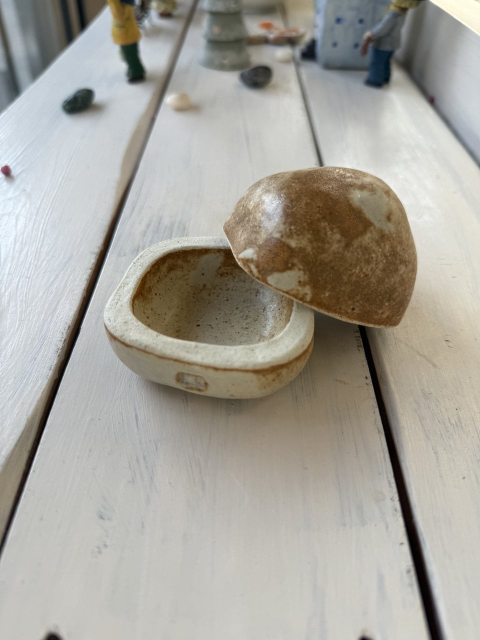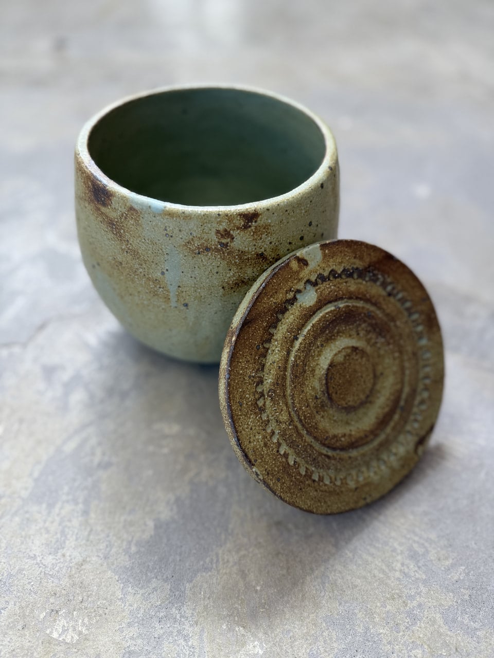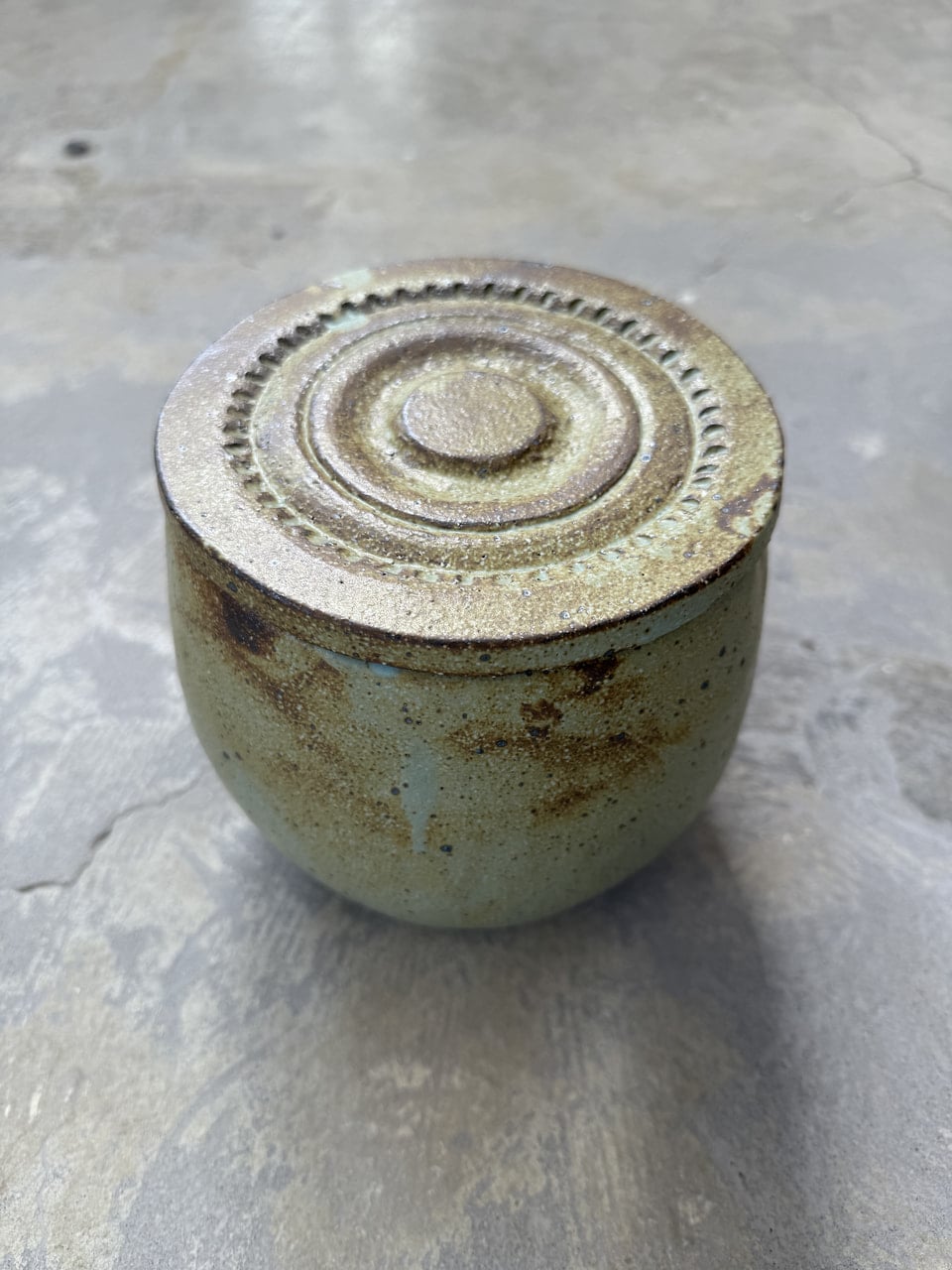 糠漬け壺と塩壺 2026年4月21日 生徒作品 食器 手びねり 直径は大きなキャベツくらいです。自作の糠漬け壺で漬けたら野菜たちも愛おしく感じますね。釉薬は青磁マットの還元です。自然なムラもまたよい雰囲気です。 同じ作者の塩壺です。古陶土、チタンマット釉、還元焼成です。辛子入れなどにも良さそうですね。 元のページへもどる
